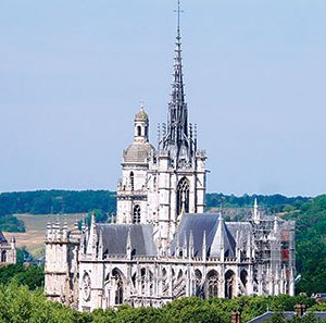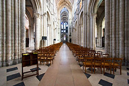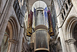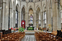 Les grandes arcades romanes de sa nef (XIIe siècle) contrastent avec le chœur de style gothique rayonnant (après la seconde moitié du XIIIe siècle) entouré d’un déambulatoire et de 13 chapelles absidiales également dites « rayonnantes » (remarquables grilles en fer forgé et clôtures en bois sculptées). La nef même est dotée de huit travées – tandis que le chœur en a quatre – et de bas-côtés s’ouvrant sur 10 chapelles latérales du XIVe siècle… Découvrez aussi à l’intérieur de l’immense monument le gothique flamboyant du transept et l’impressionnante tour lanterne du XVe siècle, les nombreux et magnifiques vitraux (avec, s’ajoutant au rouge, au bleu et au vert, le fameux jaune d’Évreux !), la chapelle axiale de la Mère de Dieu agrandie sous Louis XI (qui forme comme une petite église à l’intérieur de la cathédrale) ainsi que, en plus de l’orgue de chœur, le grand orgue contemporain. Un premier orgue avait été installé dans la cathédrale au XVIe siècle, remis en état et complété au XVIIIe. Il a été en partie démantelé dans la seconde moitié du XIXe et l’ancien buffet détruit dans un incendie lors des bombardements de 1940. Un orgue de substitution venu de la ville hollandaise de Delft avait été installé dans les années 1970.