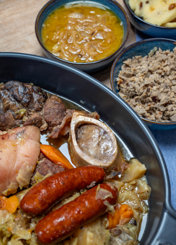 Spécialité de Basse-Bretagne, le kig ha farz marie, dans un bouillon, légumes et viandes à deux farz, un noir (à base de farine de sarrasin) et un blanc (à base…